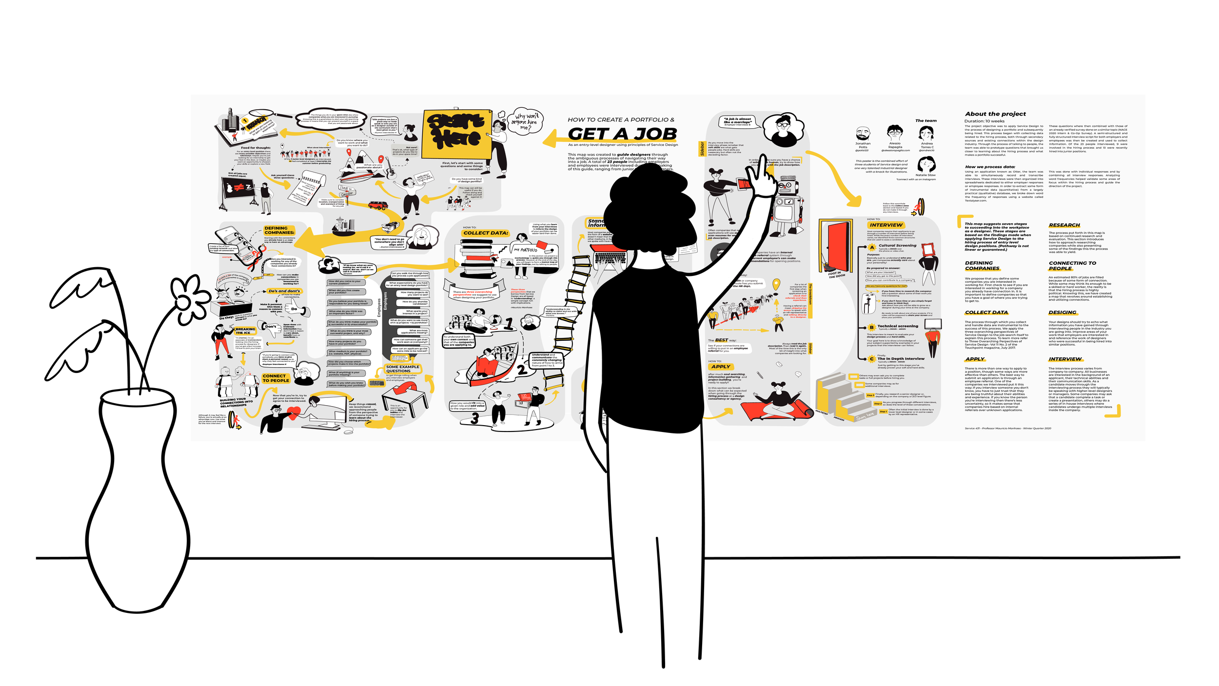 What follows is the combined results of three Service Designers, Alessio Rapaglia (myself), Andrea Torres, and Jonathan Potts, as we researched ‘how to get a job’. Along with illustrations from Natalie Stow, Industrial Designer.